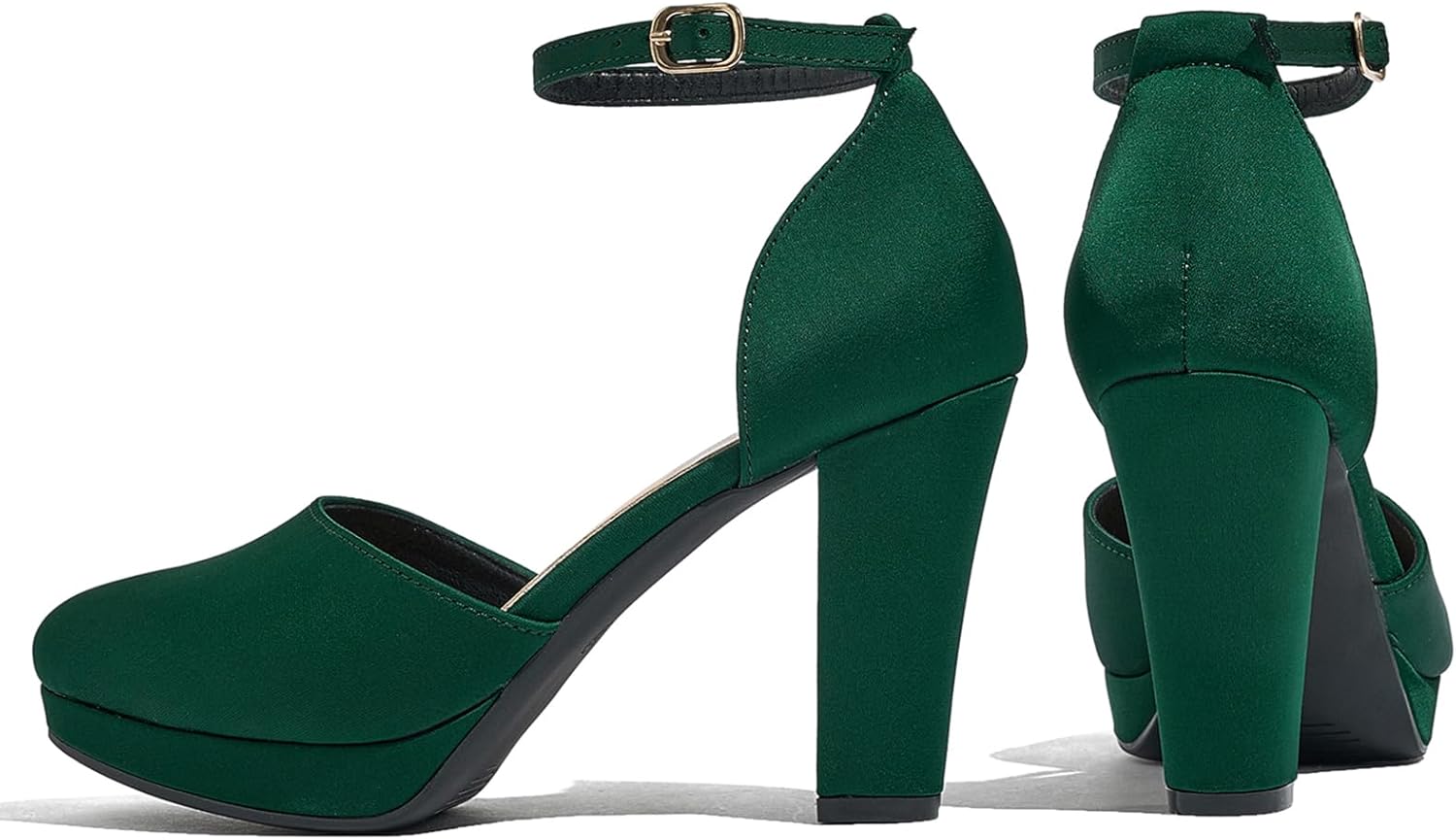 High Block Heels Pumps Round Closed Toe Ankle Strap Dress Wedding Shoes