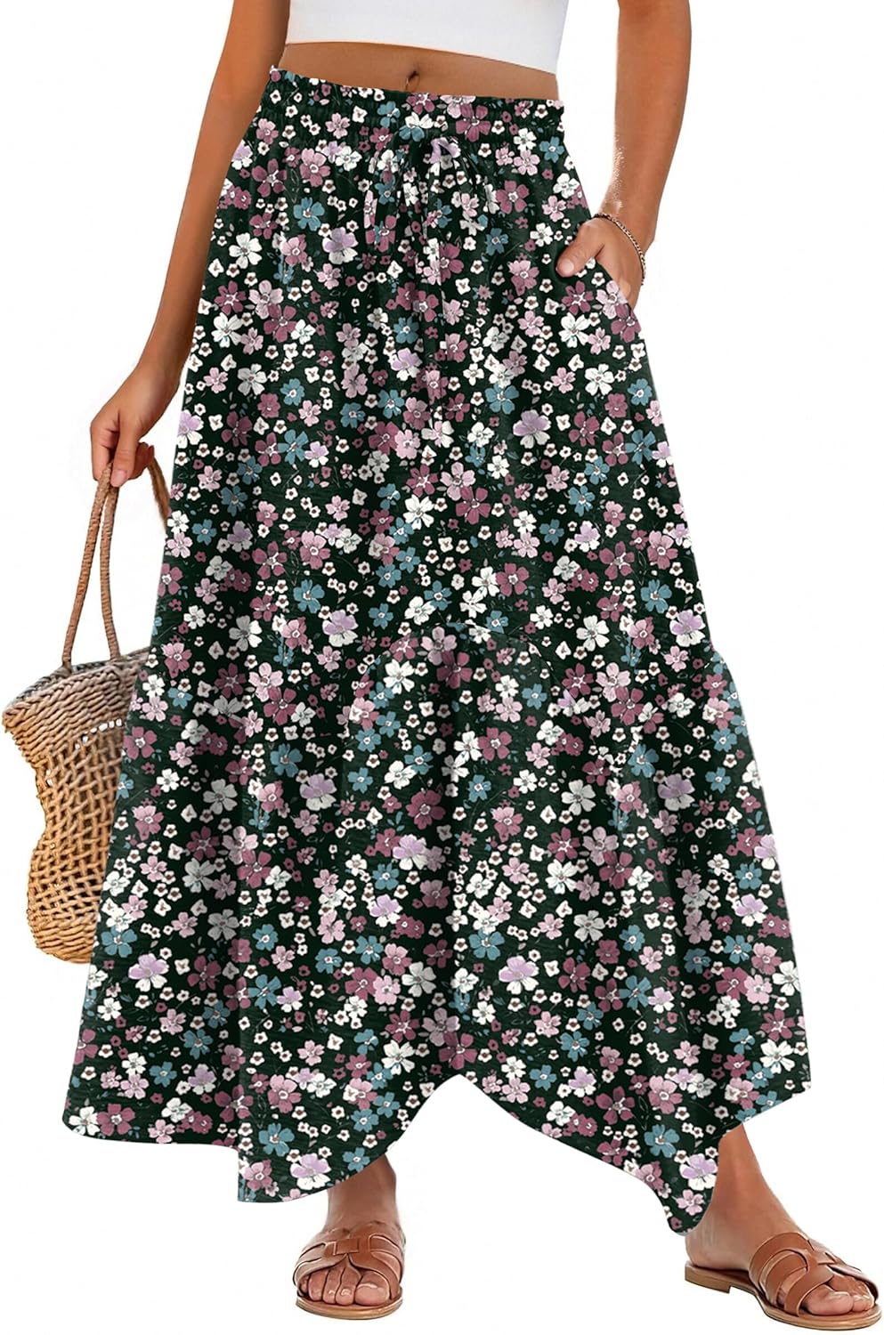 Long Skirts for Women High Waist A Line Skirt Casual Flowy Tiered Skirt with Pockets Summer Floral Skirt
