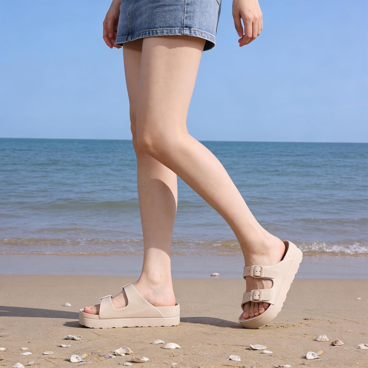 Platform Sandals with Arch Support, Chunky Lightweight Foam Slip on Slides, Comfortable Summer Beach Sandals with Adjustable Buckle